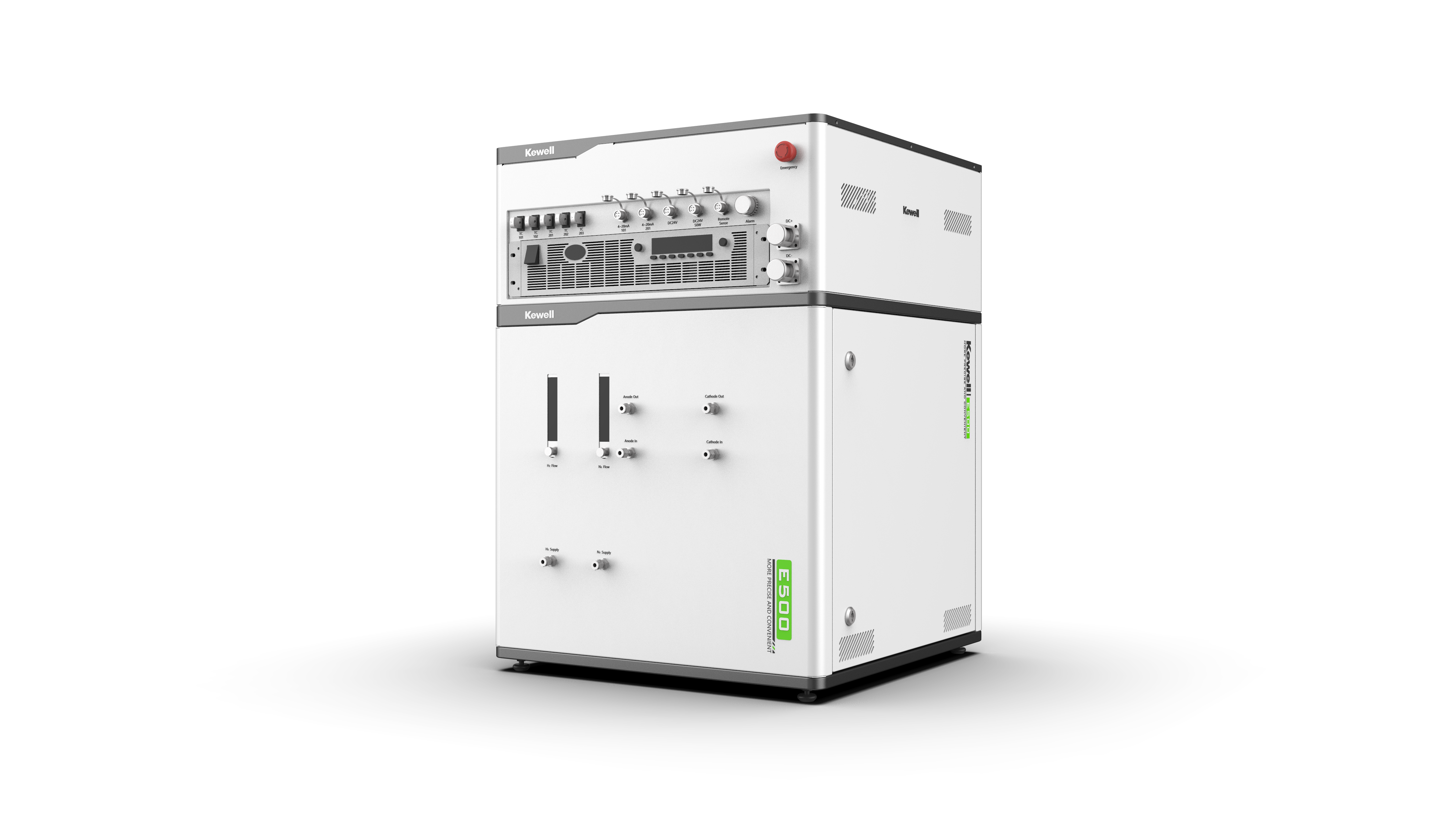基于PEM电解槽核心材料开发周期长,前期材料筛选及工艺开发任务量大,后期耐久评测时间长的特点,采用单一通道设备开发效率低且成本高的问题。针对PEM电解槽核心材料在材料筛选测试、活化及工艺测试、性能对比测试、耐久寿命评价等应用。Kewell推出了E500系列PEM单池多通道测试台,整体采用模块化布置设计,具备8模块/12通道的扩展能力,可进行多组平行对比试验,高效完成测试开发,为用户提供更优的解决方案。