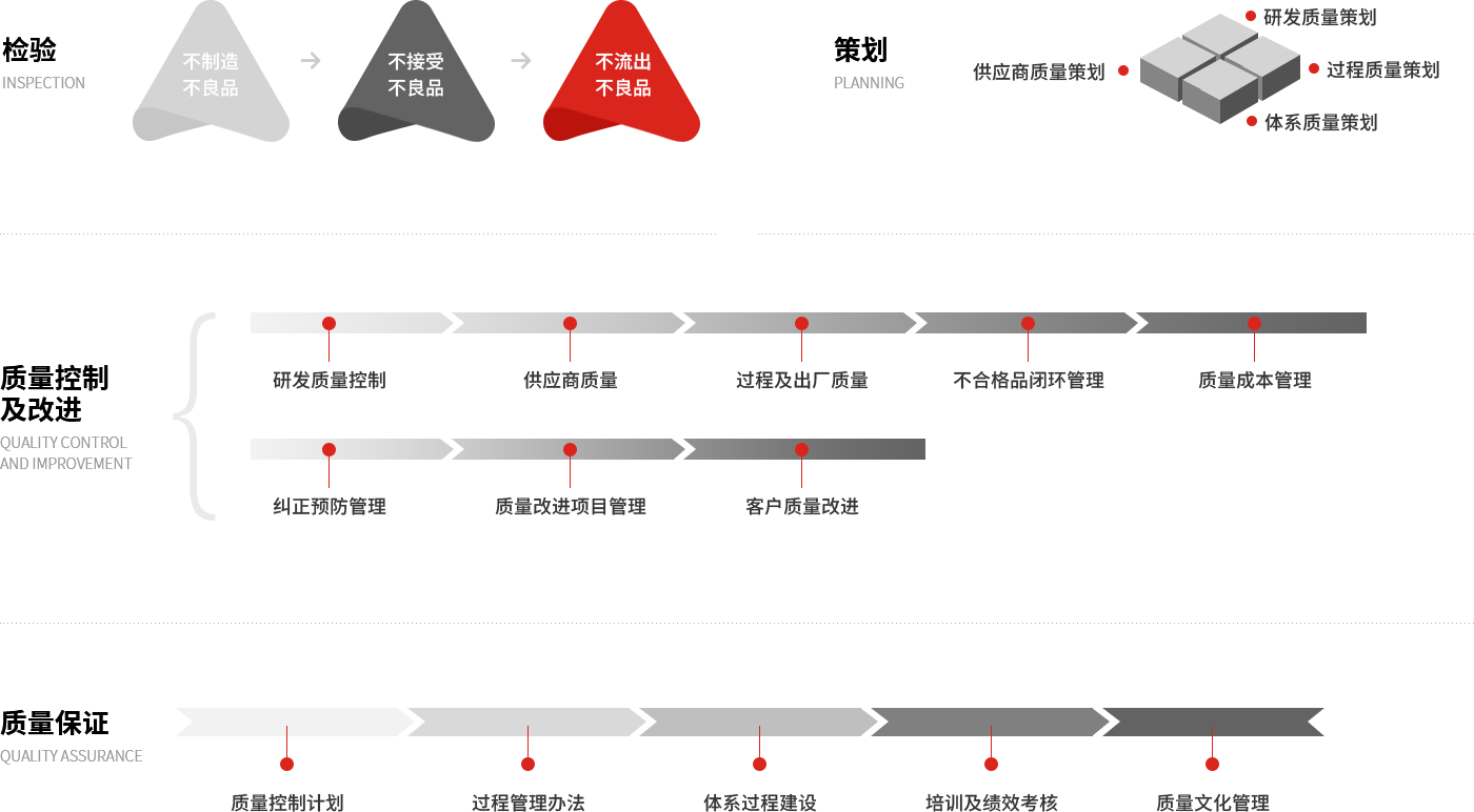 公司质量采用科学的质量管理方法,制定了“技术创新、质量可靠、信守承诺、客户满意”的质量方针,践行了“满足要求、一次做对、尽心尽力、不断改进”的质量文化。公司注重加强质量体系流程建设和意识文化建设,不断提升公司的组织能力和质量品牌影响力。